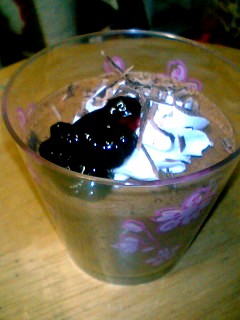 私はホイップ絞って、チョコを包丁(スプーンとかでも可)で削ったのをのっけて、兄上が丁度昨日買ってきたブルーベリージャムを乗っけました。見た目はそこそこな感じ?