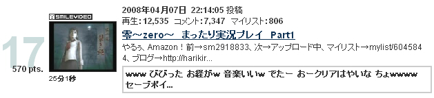 ランキング見てたら20時40分頃に総合で零~zero~まったりパート1が17位にあがってました。