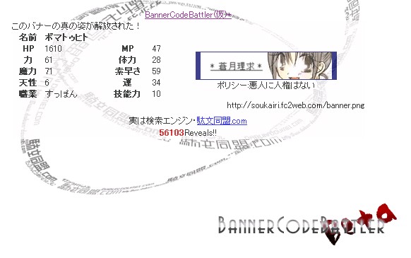 今日はふらりと見つけた駄文同盟さんのとこのバナーコードバトラーで遊んでみました。